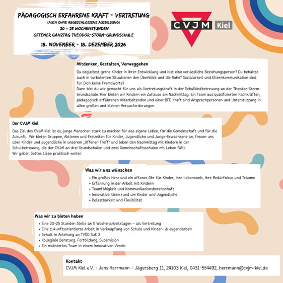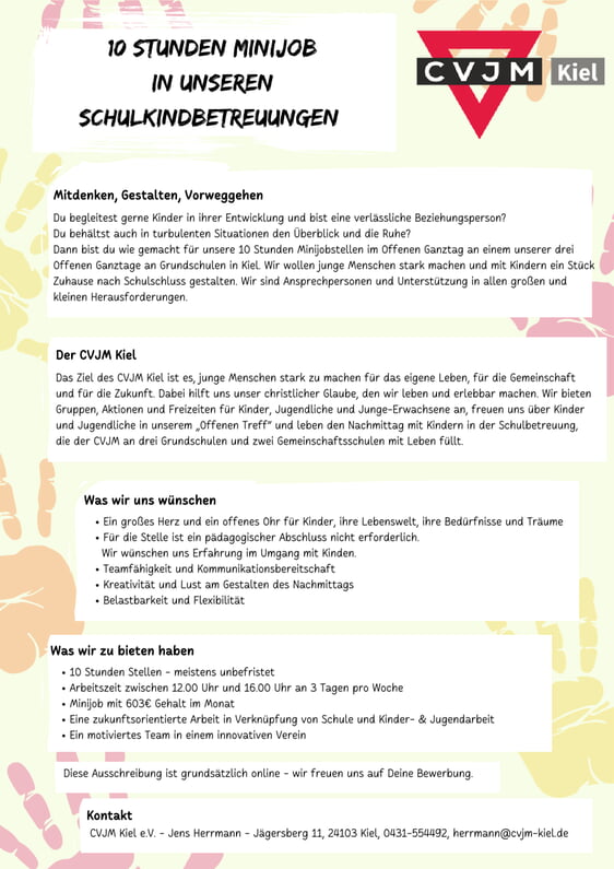 Im Kinder- & Jugendhaus, den Offenen Ganztagen an Schule, der Verwaltung oder auch rund um unser CVJM Haus haben wir immer wieder Stellen für pädagogische Mitarbeitende frei.