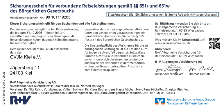 Reiseveranstalter sind gesetzlich dazu verpflichtet, einen Reisesicherungsschein auszustellen. Der Sicherungsschein dient zum Schutz für den Fall, dass der CVJM Kiel e.V. zahlungsunfähig wird. Es handelt es sich um eine Insolvenzabsicherung, bei der die Versicherung die von den Teilnehmenden bereits erfolgten Zahlungen erstattet.